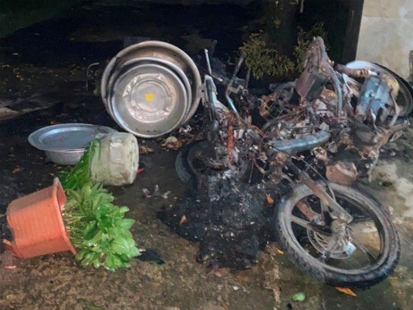 Chưa dừng lại, Thạch dắt 2 chiếc xe máy và 1 chiếc xe đạp điện của gia đình ra trước cổng nhà rồi châm lửa đốt khiến 3 chiếc xe và một số vật dụng khác bị lửa thiêu rụi.