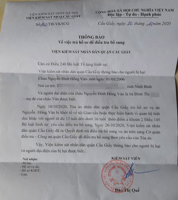 Ngày 11/11, trao đổi với chúng tôi, chị Đinh Thị Mai (xin phép được thay đổi tên, quê ở Ninh Bình) cho biết, gia đình chị đã nhận được thông tin phía TAND quận Cầu Giấy (Hà Nội) về việc trả hồ sơ cho cơ quan CSĐT Công an quận điều tra bổ sung vụ án "Giao cấu hoặc thực hiện hành vi quan hệ tình dục khác với người dưới 16 tuổi".