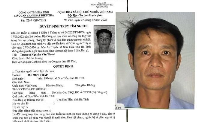 Hiện tại, Hà Huy Thập đã rời khỏi địa phương, không rõ tung tích cũng như đang làm gì. Do đó, Cơ quan CSĐT Công an tỉnh Hà Tĩnh đã ra quyết định truy tìm đối tượng này để phục vụ công tác làm rõ vụ án. Lực lượng chức năng đang ráo riết triển khai các biện pháp nghiệp vụ, đồng thời kêu gọi sự phối hợp từ người dân để sớm đưa nghi phạm ra ánh sáng.