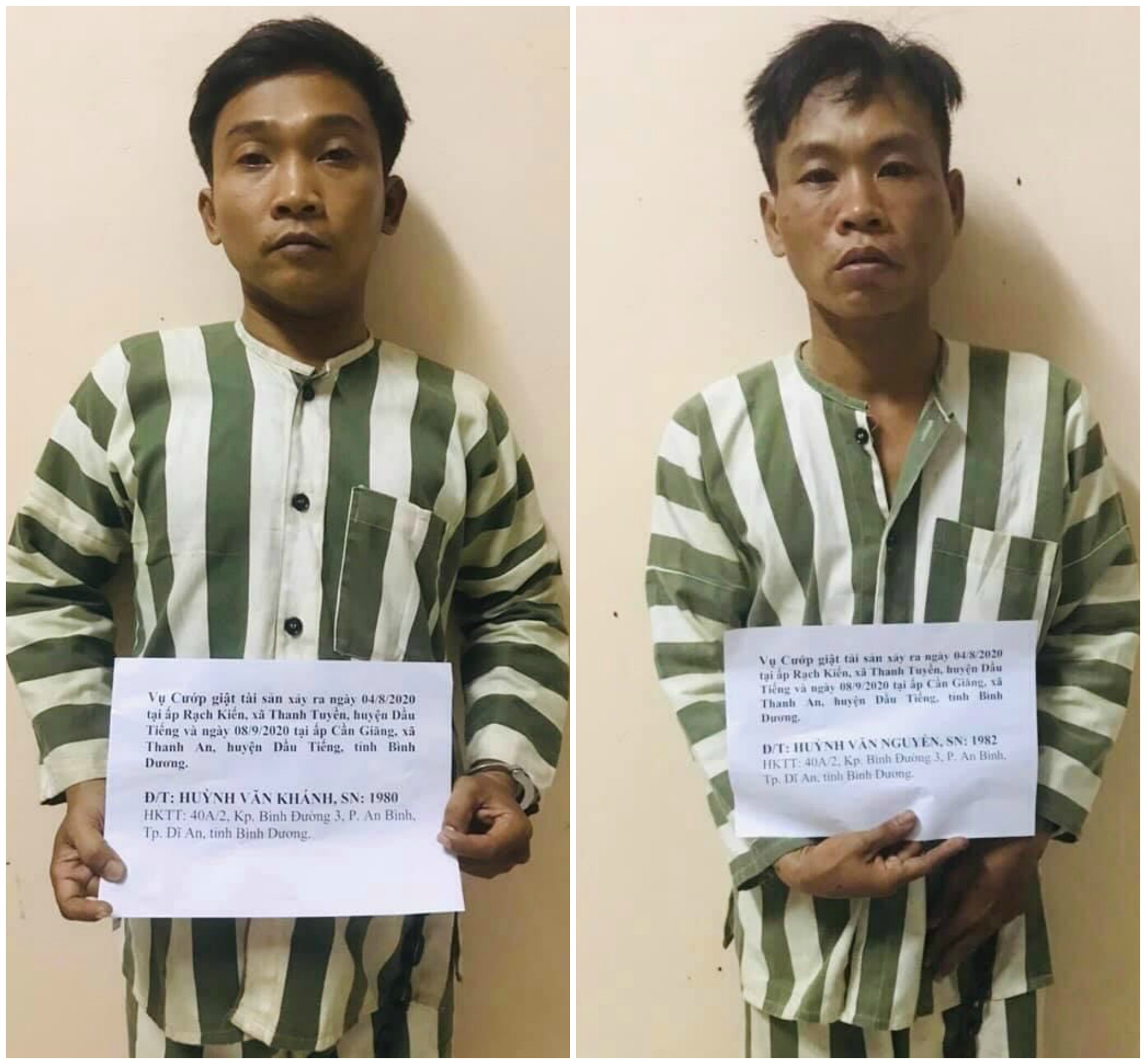 Ngày 16/9, Công an huyện Dầu Tiếng, tỉnh Bình Dương đã ra quyết định tạm giữ 2 đối tượng là Huỳnh Văn Khánh (SN 1980) và Huỳnh Văn Nguyễn (SN 1982), cùng trú tại phường An Bình, TP.Dĩ An, tỉnh Bình Dương để làm rõ hành vi cướp giật tài sản.