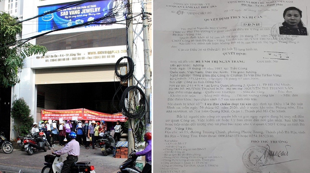 Theo hồ sơ điều tra, trong khoảng thời gian từ năm 2012 đến tháng 6/2017, Huỳnh Thị Ngân Trang - Chủ tịch HĐQT công ty Sao Vàng và Phạm Thu Hà - Giám đốc, Phó Tổng giám đốc, Thủ quỹ công ty Sao Vàng đã lừa đảo 433 khách hàng để chiếm đoạt số tiền hơn 223 tỷ đồng.