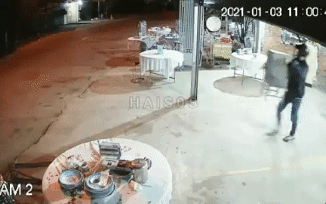 Theo đó, khi phát hiện không có ai trong nhà, một người điều khiển xe mô tô đợi sẵn bên ngoài, người còn lại đi vào trong lấy thùng tiền rồi chạy ra ngoài lên xe cùng đồng phạm tẩu thoát. Hành vi trộm cắp trên diễn ra trong chưa đầy 1 phút.
