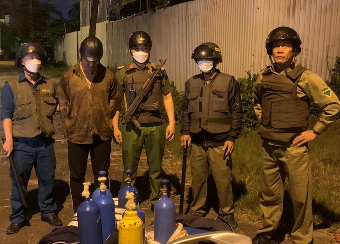 Cũng trong đêm, rạng sáng 11-3, Tổ tuần tra 8394 Công an phường Hòa Cường Bắc (quận Hải Châu) phát hiện 2 thanh niên đang chở theo hơn chục bình kim loại chứa khí cười nên tiến hành dừng kiểm tra.