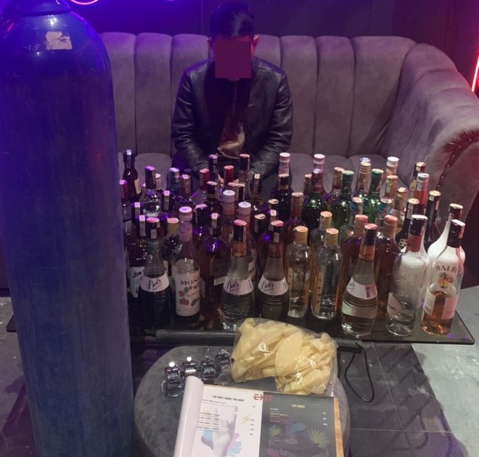 Tại đây, công an phát hiện có 15 người bao gồm cả khách và nhân viên của cơ sở cùng 1 bình chứa khí cười, nhiều dụng cụ để chiết tách và 19 vỏ bóng đã qua sử dụng và bảng báo giá bóng cười cho khách.