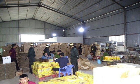 Thời điểm kiểm tra, tại cơ sở có khoảng 10 người đang dán nhãn sản phẩm mang thương hiệu nước tăng lực Number One lên các chai nhựa có chứa nước màu vàng bên trong. Sau khi dán nhãn, các chai này được đóng vào các thùng cactông (loại 24 chai/thùng).