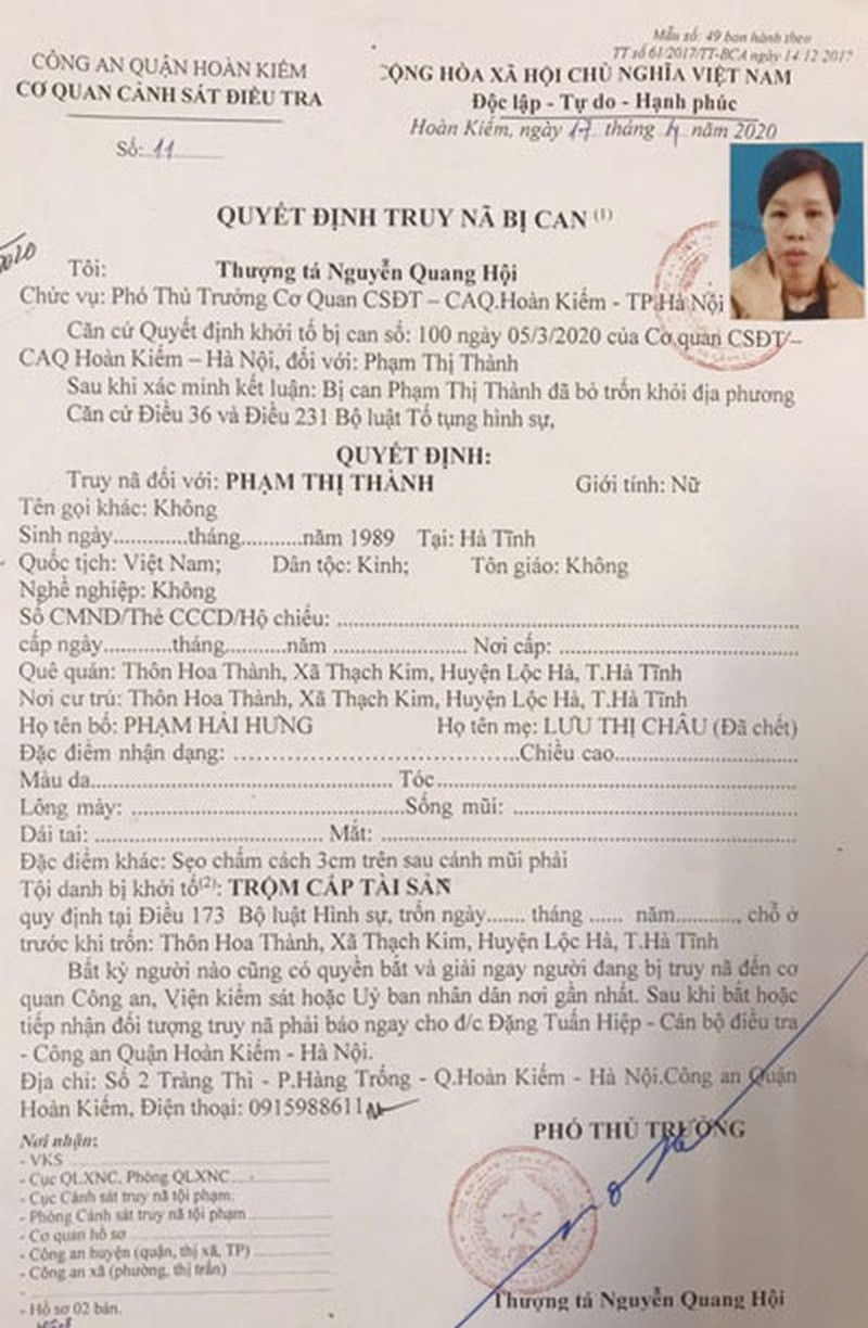 Trước đó, ngày 17/4, Phạm Thị Thành bị Công an quận Hoàn Kiếm phát lệnh truy nã về tội “Trộm cắp tài sản” nên Công an thị xã Sơn Tây đã bàn giao đối tượng Thành cho Công an quận Hoàn Kiếm (Hà Nội) tiếp tục điều tra, làm rõ về tội trên.
