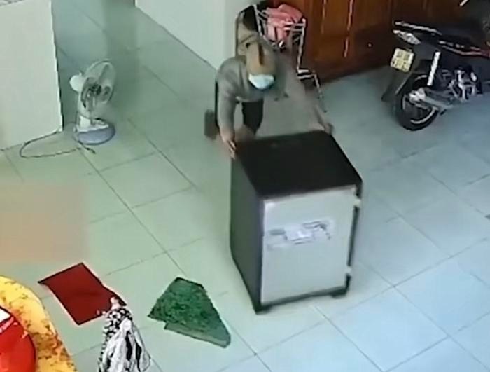 Sau khi chắc chắn chủ nhà còn lâu mới về, tên trộm mới vất vả đẩy chiếc két sắt ra giữa nhà. Sau khi mất hơn 20 phút hì hục, mồ hôi ướt cả áo thì kẻ lạ mặt cũng đã mở khoá thành công chiếc két sắt vô cùng chắc chắn.