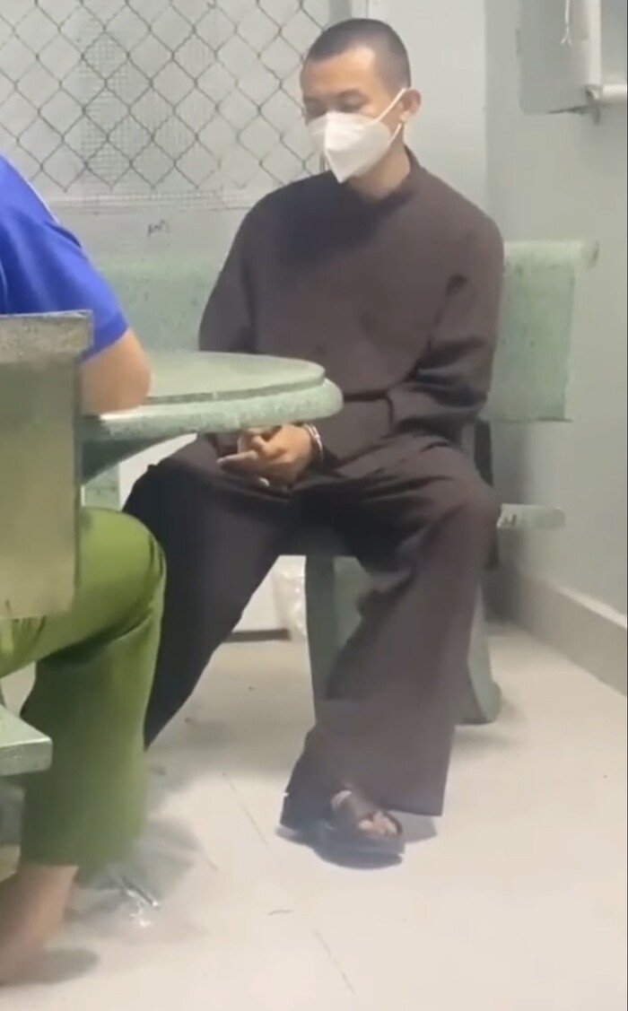 Lúc này, Nhất Nguyên đang mặc áo nâu Phật tử, đeo khẩu trang và hai tay bị tra vào còng số 8. Trong một bức ảnh, “đồ đệ ruột” của “thầy ông nội” đang ngồi trên ghế với gương mặt thẫn thờ, tâm trạng chán chường.