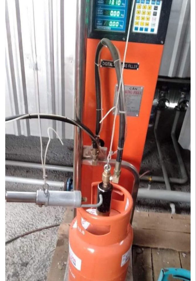 Thông qua cột bơm, gas được chiết từ bình chứa sang các loại bình mang nhãn hiệu khác nhau.