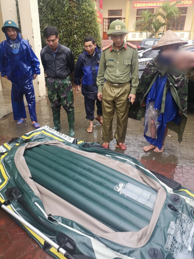 Ông Trần Huy Quyên, Trưởng thôn Tam Trung, xã Cẩm Vịnh cùng một số cán bộ thôn chèo thuyền hơi được trang cấp để đi cứu hộ người dân.