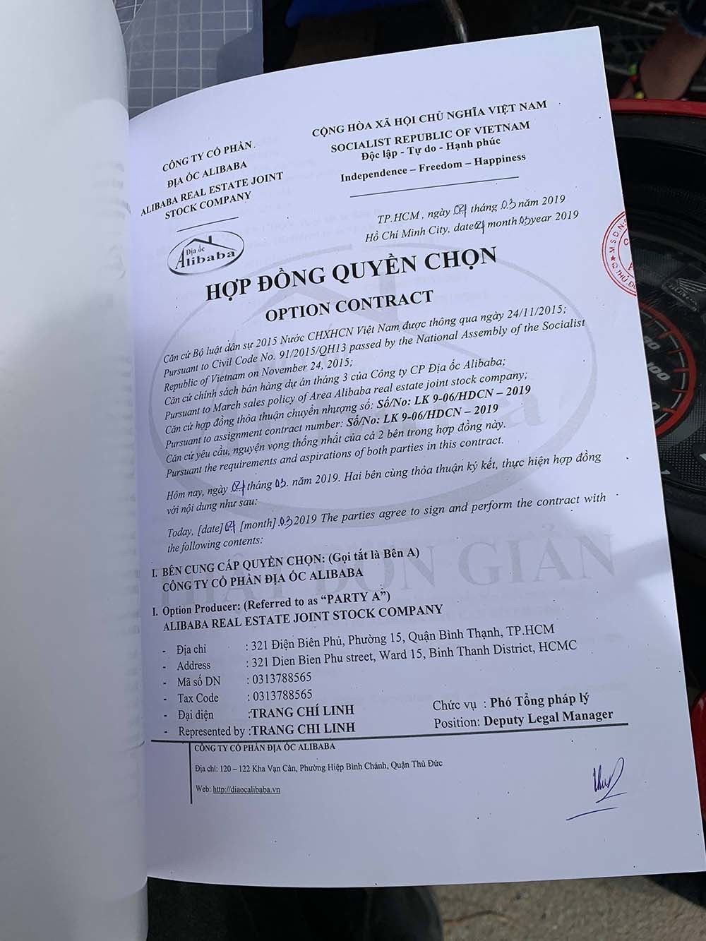 Nhưng sau đó, ông Q. ký “hợp đồng quyền chọn” với địa ốc Alibaba cho công ty này thuê lại với lợi nhuận cam kết 12%/6 tháng. Đến hạn nhận lãi suất, ông Q. liên hệ với người Alibaba thì chỉ nhận được những lời hứa hẹn. Cuối cùng biết bị lừa, ông Q. đã có đơn tố cáo đến Bộ Công an.