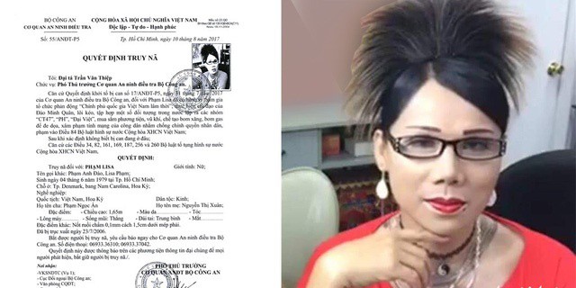 Tháng 8/2017, Cơ quan An ninh điều tra, Bộ Công an ra quyết định khởi tố bị can, truy nã Phạm Lisa về tội “Khủng bố chống chính quyền nhân dân” theo Điều 84 BLHS Việt Nam.