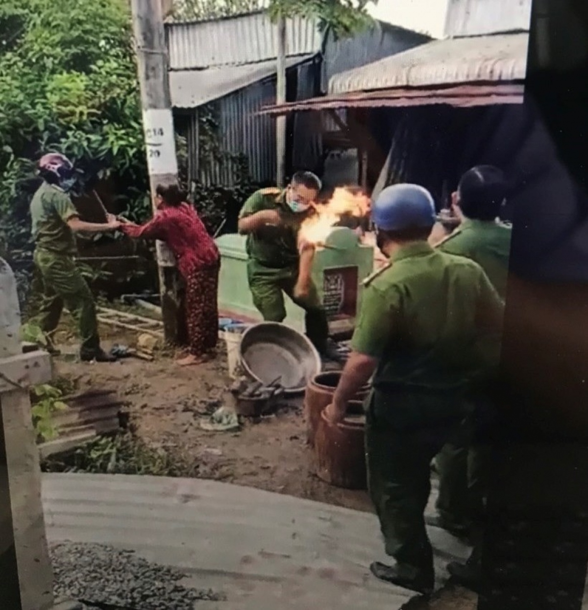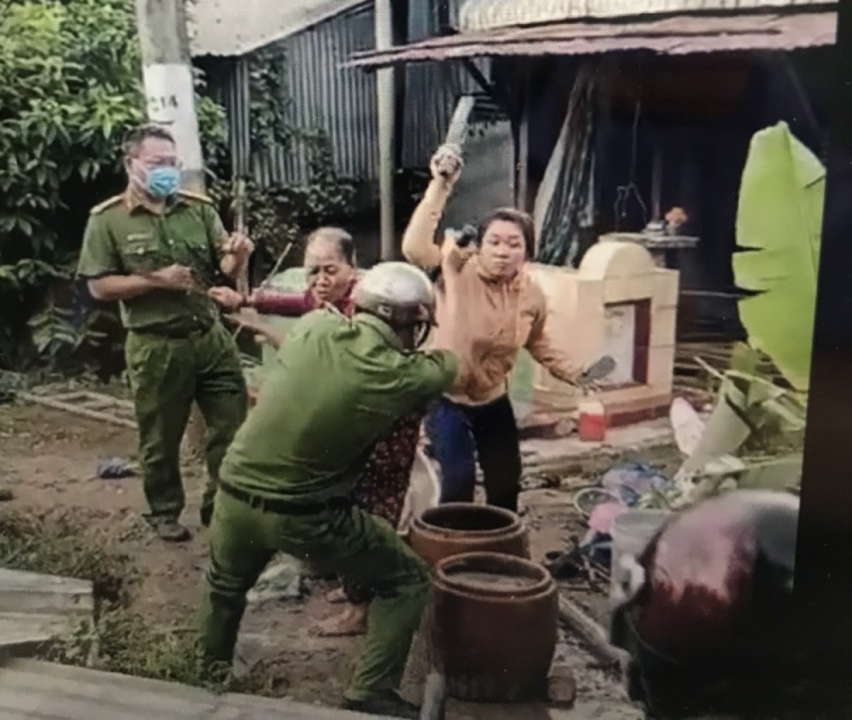 Sau đó, bà Phượng, Phân và thành viên trong gia đình dùng nước sôi, xăng, gậy gộc tấn công lực lượng công an. Riêng bà Phượng có hành vi dùng rọi quấn vải đã tẩm xăng đốt ném về phía lực lượng công an. Trong lúc châm lửa đốt, Phượng bị bỏng. Công an xã Bình Phú tiến hành khống chế đưa những người liên quan vụ việc về trụ sở để làm rõ, xử lý theo quy định pháp luật.