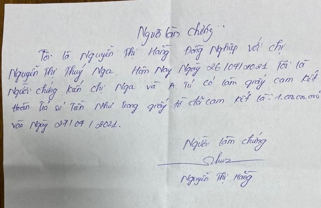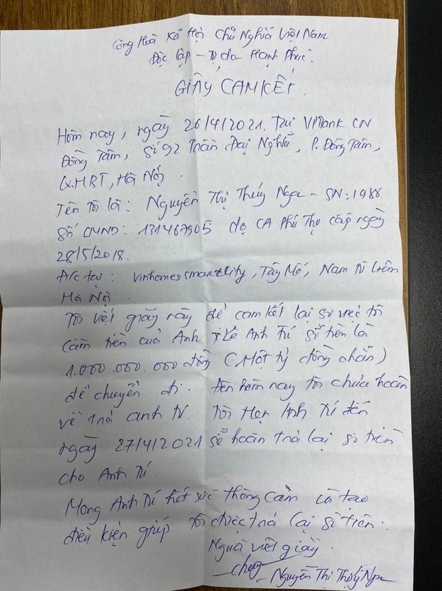 Ngày 26/4, tại trụ sở Chi nhánh Ngân hàng VP Banh Đồng Tâm, chị Nga có viết giấy thừa nhận đã tự ý chuyển 1 tỷ đồng của anh Tuấn Anh sang tài khoản khác. Trong đơn cam kết, chị Nga có hẹn, sẽ trả lại số tiền 1 tỷ đồng vào ngày 27/4 cho anh Tuấn Anh. Tuy nhiên, tới nay đã 3 tháng anh Tuấn Anh vẫn chưa được chị Nga trả lại như cam kết. Đáng chú ý, kể từ đó tới nay, phía Ngân hàng VP Bank cũng không đưa ra phương án giải quyết cụ thể nào đối với anh Tuấn Anh khiến anh này bức xúc.