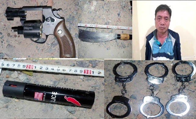 Tang vật công an thu giữ gồm 1 súng (kiểu dáng Rulo), 7 viên đạn (5 viên trong ổ xoay và 2 viên trong giỏ), 1 bình xịt hơi cay, 3 khóa số 8, 1 súng bắn điện, 1 con dao, 1 đoạn dây dù và 1 cuộn băng keo.