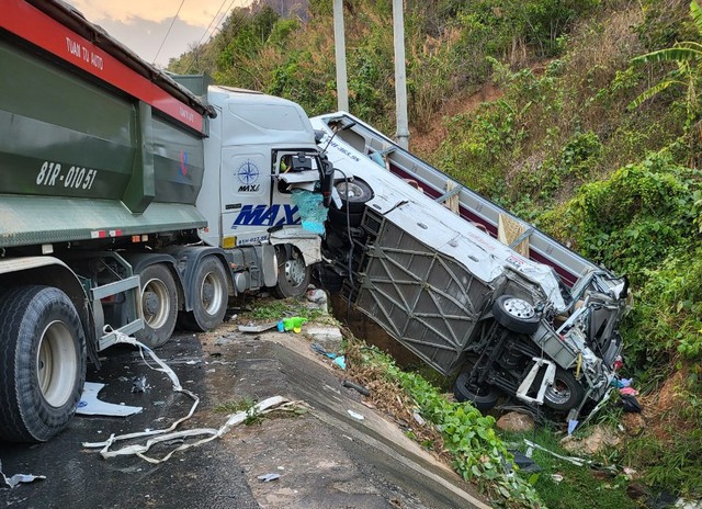 Lúc này, xe khách đã tông vào xe tải chạy chiều ngược lại, sau đó lật nghiêng bên vệ đường.