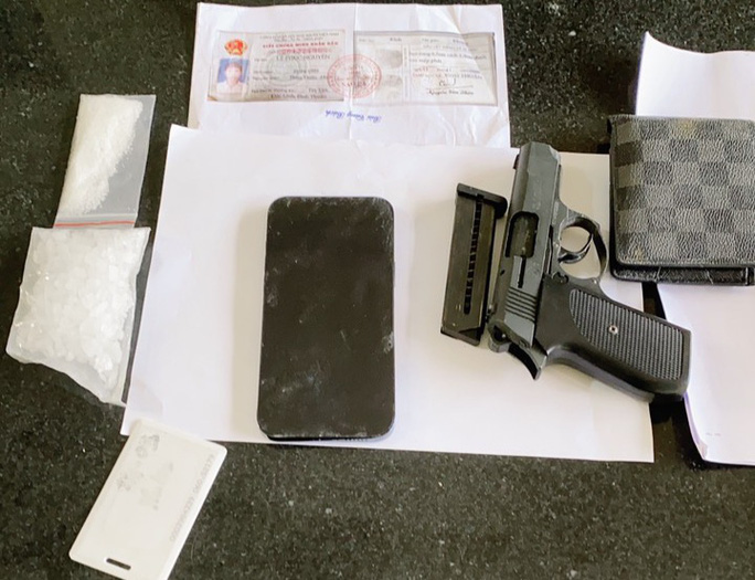 Tiếp tục kiểm tra, công an phát hiện Nguyên mang theo 2 túi nylon chứa tinh thể màu trắng nghi là ma túy cùng 1 khẩu súng bắn đạn cao su.