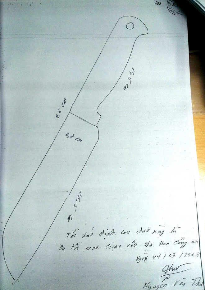 Ngày hôm sau, cơ quan chức năng cho tìm lại con dao nhưng không thấy, kể cả phần lưỡi dao bằng kim loại. Theo hồ sơ vụ án, ông Thu xác nhận đã ra chợ mua một con dao khác để giao nộp cho công an.