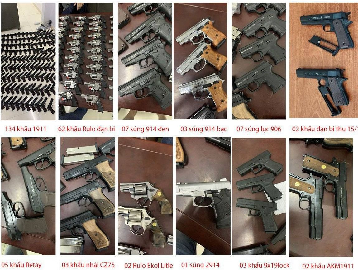 Lập tức, Công an khám xét khẩn cấp nhà kho nói trên và thu giữ 229 khẩu súng, trong đó có 134 khẩu kiểu súng lục M911 bắn đạn bi; 64 khẩu súng rulo; 31 khẩu súng lục các loại bắn đạn cao su và hơi cay và 455 bình khí nén; 6kg đạn bi sắt cùng nhiều linh kiện, phụ kiện của súng…