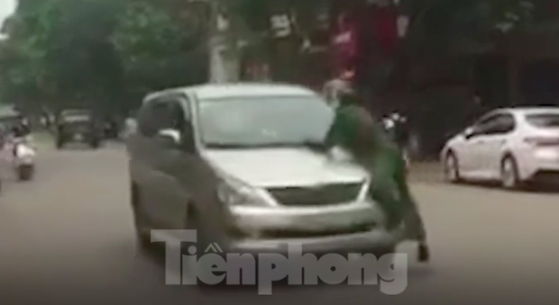 Thấy xe lao đến, cả tổ công tác vội dạt tránh, tuy nhiên một chiến sĩ Cảnh sát trật tự trong tổ công tác không tránh kịp nên đã bật lên đu bám vào nắp ca pô xe để đảm bảo an toàn.