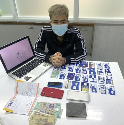 Thời điểm bị bắt quả tang, đối tượng đang giữ 16 thẻ ngân hàng ATM, 30 sim điện thoại, 1 máy tính xách tay cùng nhiều tang vật liên quan.