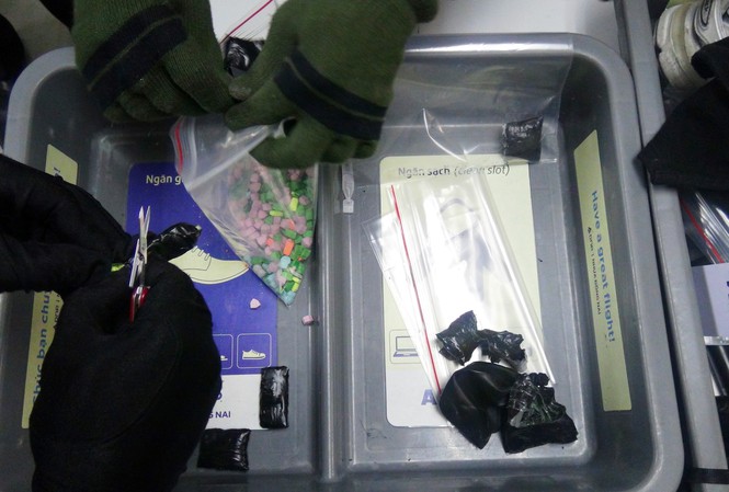 Bằng các biện pháp nghiệp vụ, lực lượng kiểm soát an ninh hàng không Tân Sơn Nhất đã phát hiện người đàn ông tên J. JA mang theo 400 viên nén màu xanh lá cây, xám, cam, xanh dương, xanh đọt chuối, hồng (nghi là ma túy tổng hợp) được giấu trong cạp quần.