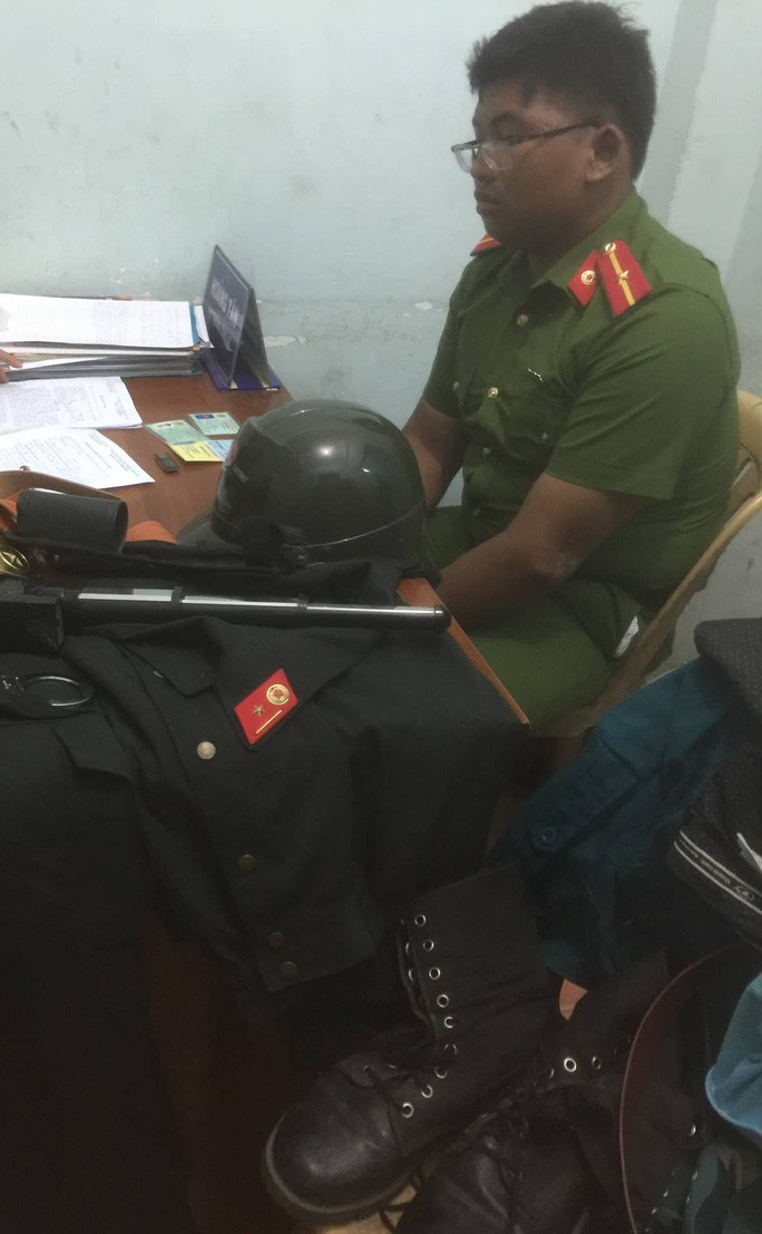 Tại cơ quan công an, Đệ đã giao nộp bộ trang phục công an đang mặc, 1 bộ trang phục Cảnh sát cơ động cùng bộ cầu vai kết hợp, 1 cây roi điện, 1 cây gậy 3 khúc và 1 còng số 8.