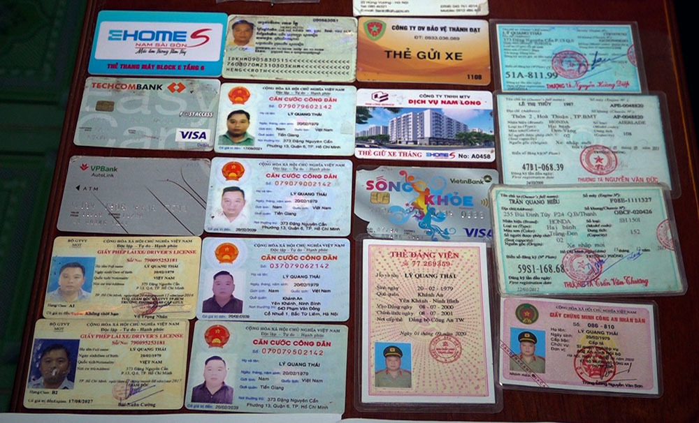 Công an thu giữ trên người Thái nhiều giấy tờ giả như: thẻ đảng viên, chứng minh CAND và nhiều thẻ căn cước công dân cùng các giấy tờ khác mang tên Lý Quang Thái.