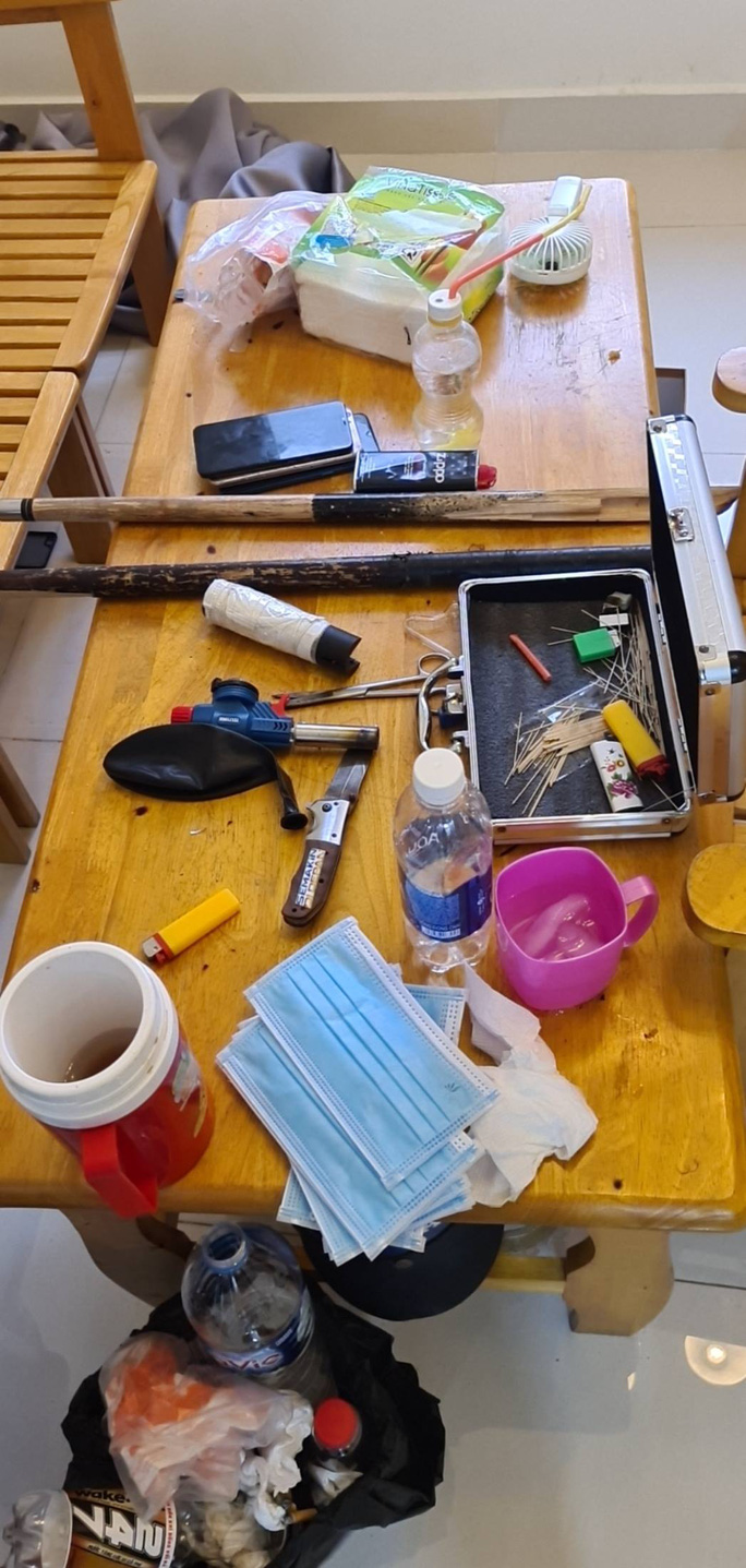 Kiểm tra một căn hộ khác của chung cư, công an phát hiện 4 thanh niên đang tổ chức sử dụng ma túy với nhau. Bên cạnh đó, khám xét nơi ở của Kiên, lực lượng công an còn phát hiện và thu giữ tổng cộng 2,3 kg ma tuý, nhiều hung khí và tang vật liên quan.