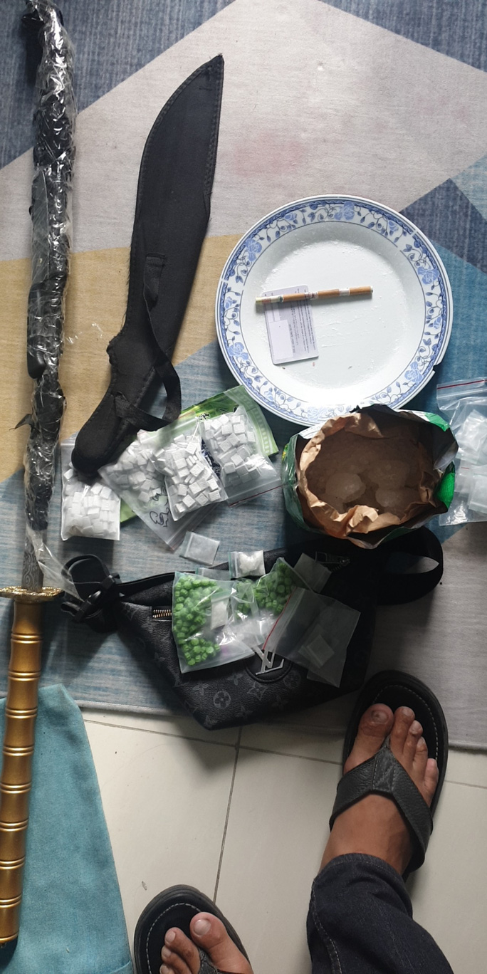 Bên trong, công an phát hiện, thu giữ hơn 500 viên nén và gần 1,8kg tinh thể không màu nghi là ma túy cùng nhiều hung khí.