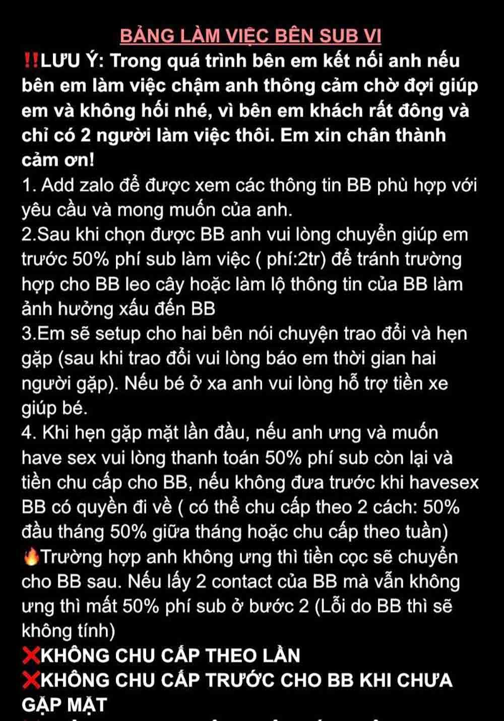 Riêng khách biết thông tin từ các nhóm kín, khi liên hệ riêng qua tài khoản zalo với Vy sẽ được nhận thông tin, hình ảnh nhưng không có số điện thoại liên lạc, của hàng loạt chân dài.