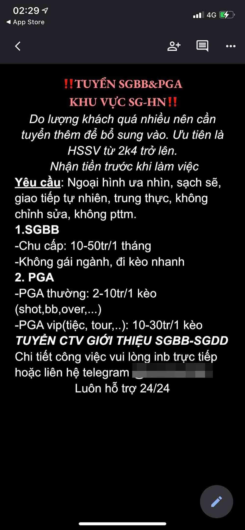 Quản lý nhiều nhóm kín trên mạng xã hội, trong đó có nhóm kín trực tiếp điều hành có đến 1.500 thành viên, Vy đăng công khai tuyển dụng Sugar baby và các thông tin về dịch vụ cung cấp Sugar baby cho khách hám của lạ tiếp cận. Tất cả đều liên hệ với Vy qua tài khoản Zalo “VV” hoặc tài khoản Telegram “Twonint”.