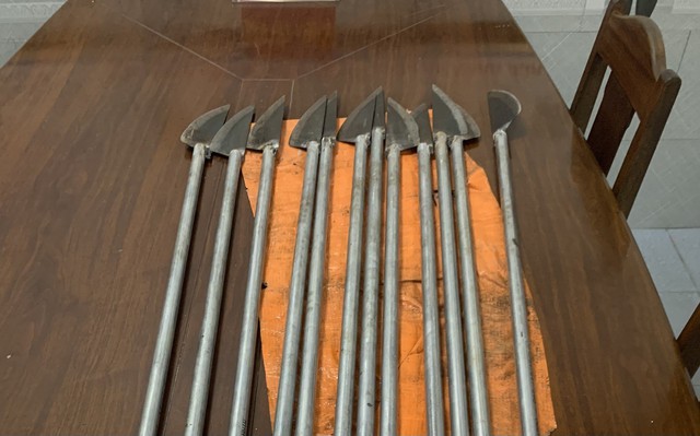 Tang vật thu giữ gồm 12 cây dao phóng lợn, mỗi cây dài khoảng 1,8m có hàn lưỡi dao nhọn.