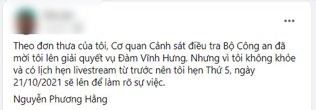 Trong giấy mời có ghi rõ mục đích mời bà Phương Hằng đến trụ sở làm việc liên quan tới "Đơn yêu cầu đề nghị xử lý hành vi vi phạm pháp luật của ca sĩ Đàm Vĩnh Hưng" mà bà đã gửi trước đó. Thời gian dự kiến vào 14h ngày 19/10.