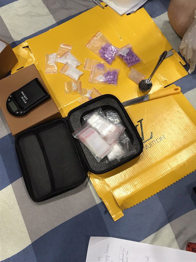 Tang vật thu giữ gồm 1 gói tinh thể rắn màu trắng và 1 viên nén màu tím. Hưng khai nhận là ma túy tổng hợp dạng Ketamine và thuốc lắc đang mang đi bán.