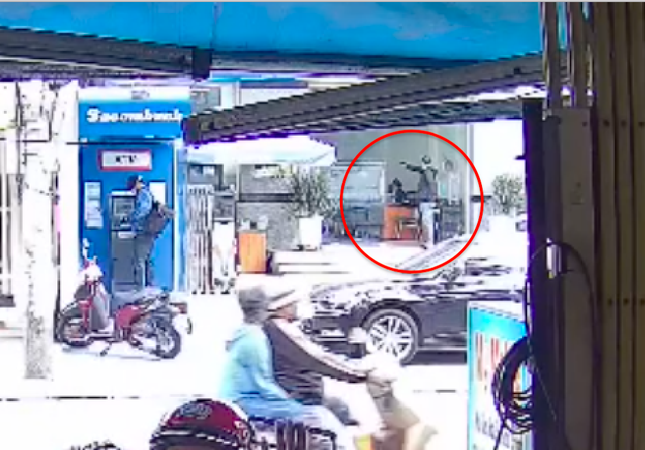 Chưa đến một phút sau, một thanh niên cầm một vật giống súng chĩa về phía bảo vệ nhưng sau đó cùng đồng bọn chạy ra ngoài và tẩu thoát. Vụ việc được camera an ninh ghi lại.