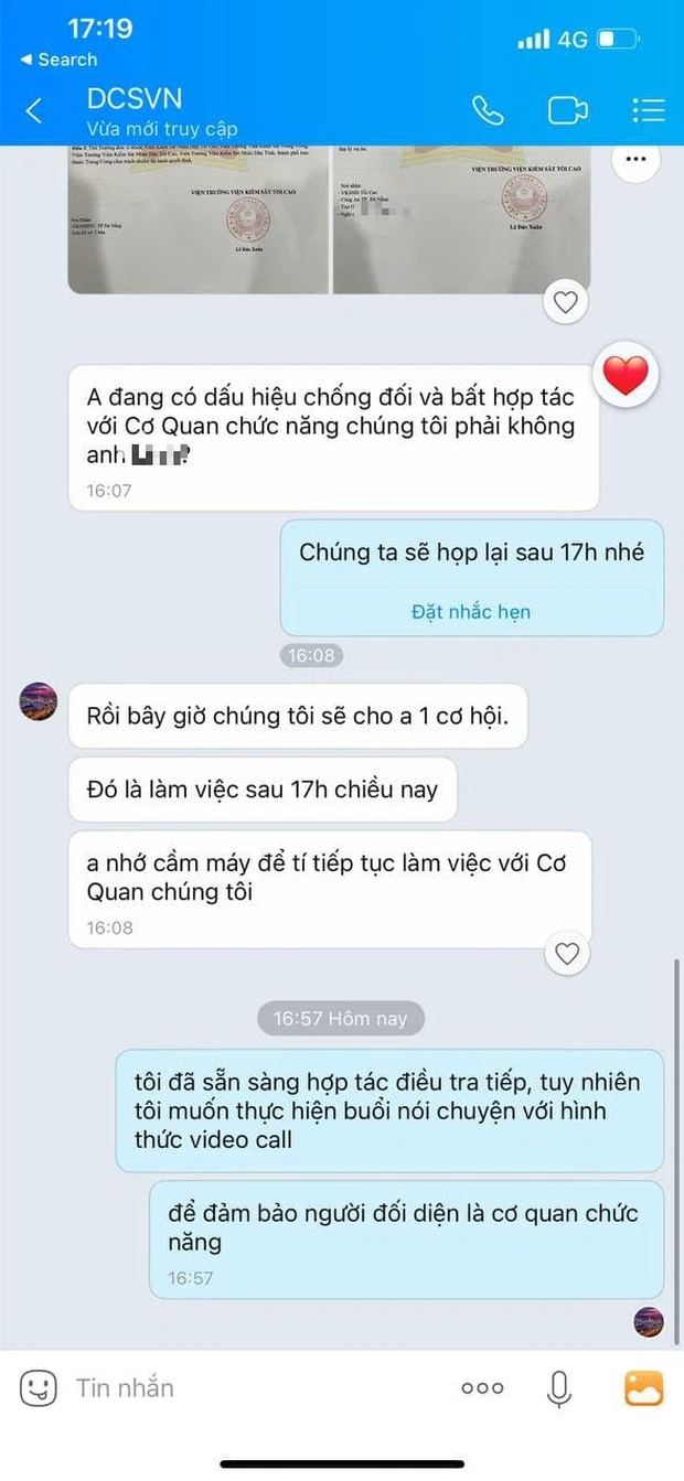 "Bọn chúng yêu cầu gọi phải nghe máy để phục vụ điều tra rồi phải chụp ảnh gửi qua Zalo chứng minh là không bị tội phạm khống chế. Tôi mới bảo thế các anh chụp lại cho tôi xem ảnh mặt công an thì chưa thấy gửi. Lúc này tôi mới tỉnh tỉnh ra", anh L. kể lại sự việc.