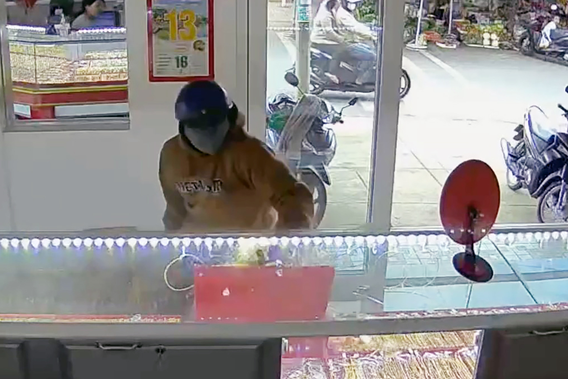 Trước đó, khoảng 14h20 ngày 13/2, Chung mặc áo khoác vàng, đội mũ bảo hiểm, đeo khẩu trang kín mặt bước vào tiệm vàng. Khi vào trong, kẻ này quan sát một lúc rồi cầm rìu đập mạnh vào tủ kính, khiến tủ vỡ ra, sau đó thò tay vơ vàng rồi bỏ chạy.