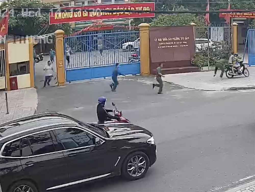 Lúc này, một phụ nữ chở con nhỏ đến gửi cơm cho Tâm thông qua cán bộ công an phường. Khi người phụ nữ này vừa nổ xe máy rời đi thì Tâm chạy từ trong trụ sở ra và leo lên xe.