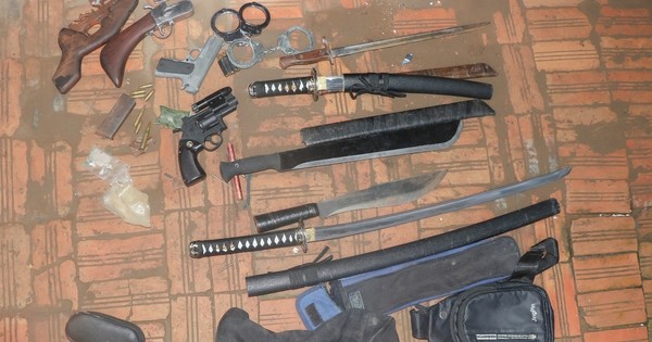 Qua kiểm tra, lực lượng chức năng phát hiện 1 túi màu đỏ, bên trong chứa 5 con dao tự chế có chiều dài từ 10-100 cm, 2 còng số 8, 4 cây súng, 14 viên đạn và 3 túi ni-lông chứa hoá chất và chất nhựa trắng.