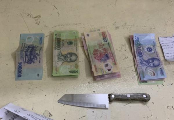 Lục soát trên người đối tượng, công an thu giữ tang vật gồm con dao gây án dài khoảng 20cm, cùng số tiền hơn 2,6 triệu đồng đối tượng này vừa cướp được.