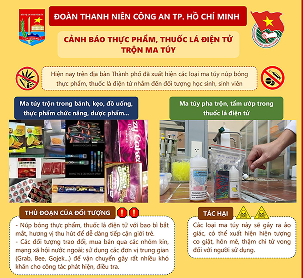 Ngoài ra, ma tuý còn được đóng gói, pha trộn, tẩm ướp dưới dạng thực phẩm, đồ uống, thảo mộc, thuốc lá điện tử... Các loại ma tuý này có bao bì bắt mắt, hương vị thu hút nên dễ dàng tiếp cận giới trẻ, đặc biệt là học sinh, sinh viên.