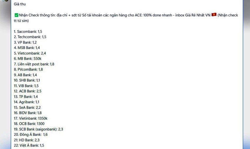 Tùy vào từng ngân hàng mà N. bán thông tin tài khoản với giá khác nhau, dao động từ 300.000 đồng đến 2,2 triệu đồng mỗi thông tin tài khoản.