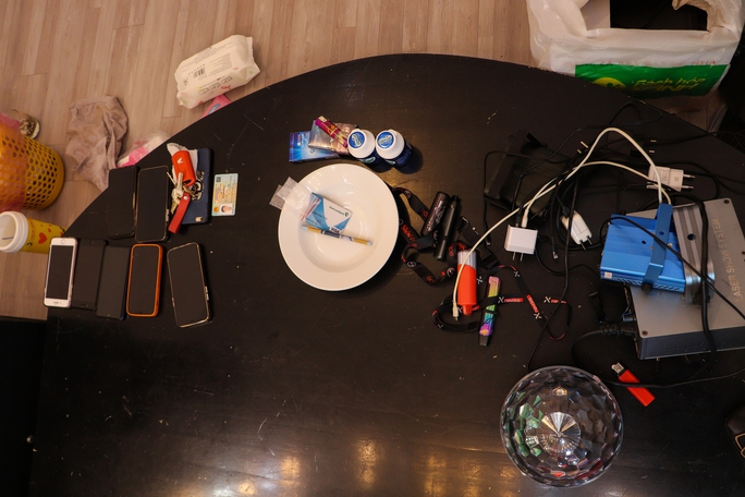 Tại hiện trường, lực lượng thu giữ 2 đĩa bằng sứ có chứa chất bột màu trắng, nghi là chất ma túy và một số dụng cụ dùng để sử dụng ma túy. Qua test nhanh, 19 đối tượng dương tính với chất ma túy.