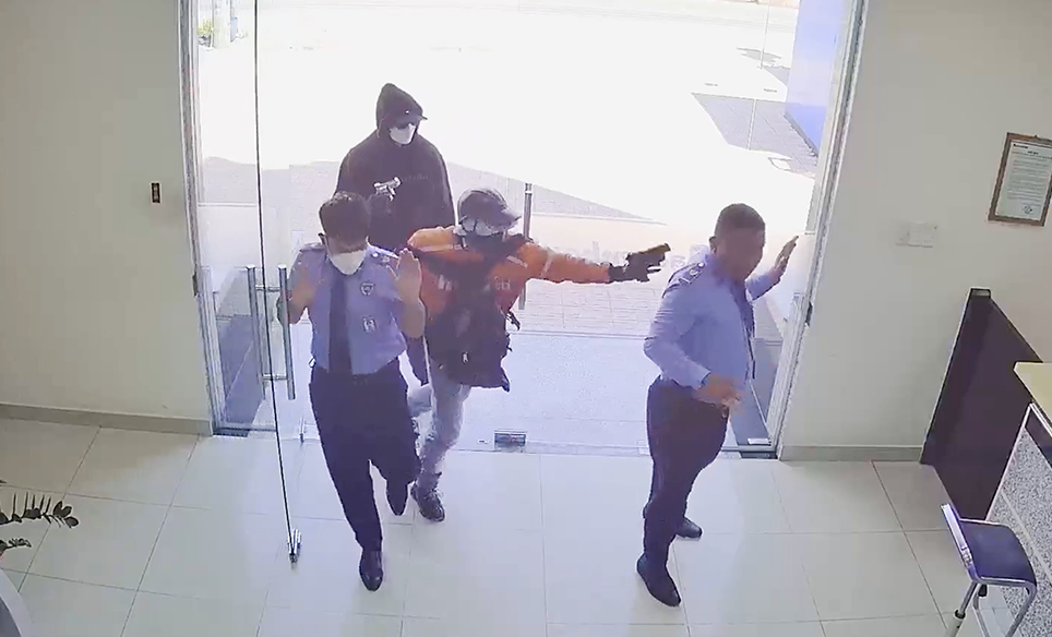Chúng dí súng và cầm trái nổ tự chế để uy hiếp giao dịch viên, cướp thành công 3,8 tỷ đồng. Trước khi tẩu thoát bằng xe máy, 2 kẻ cướp còn đe nẹt 2 bảo vệ nằm dưới sàn.