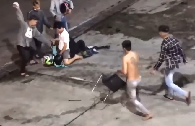 Một nạn nhân chạy ra ngoài thoát thân, người còn lại bị nhóm thanh niên đập gạch và ghế liên tiếp vào đầu. Nạn nhân bị ghì chặt xuống đất, chỉ biết ôm phần đầu (có đội mũ bảo hiểm) chịu trận.