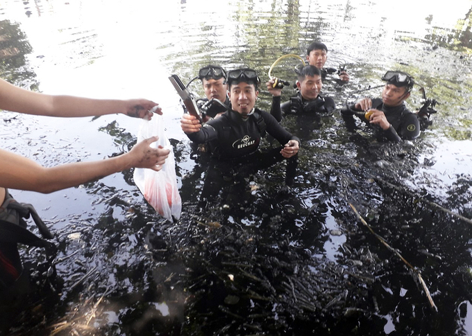 Lớp bùn dưới đáy ngập tới đầu gối khiến anh nhiều lúc bị lún, nhấc chân lên không nổi. Anh dùng tay mò, bới móc từng hốc cây dọc bờ kênh. Sau 3 giờ ngụp lặn dưới nước ô nhiễm, hối thối nồng nặc, anh cùng đồng đội chỉ thu về những khúc xương động vật, miểng chai, thanh sắt gỉ sét...