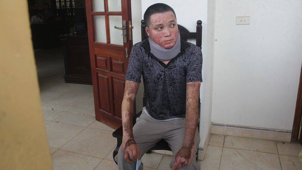 Anh Sơn được người thân dìu đến tòa với gương mặt đã bị bỏng nặng. Không những thế, toàn thân gồm tay, chân, người... của anh cũng bị bỏng rất nặng. Cổ của anh phải nẹp lại cố định do mới cấy da mới.