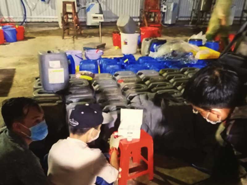 Công an thu giữ 140 lít dung dịch dạng sệt có thành phần chủ yếu là methamphetamine (ma túy đá), hơn 13 tấn hóa chất, tiền chất các loại được đựng trong các thùng, can nhựa, lọ, bao giấy… phục vụ sản xuất ma túy. Có khoảng 20 tấn máy móc, thiết bị lắp đặt thành dây chuyền đang sản xuất trái phép chất ma túy (hệ thống bình phản ứng, máy gia nhiệt, máy ly tâm, máy sấy khô…). Với lượng hóa chất, tiền chất trên, ước tính sẽ sản xuất hơn một tấn ma túy thành phẩm.