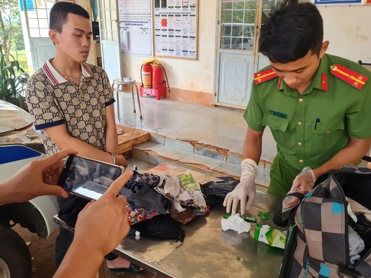 Qua kiểm tra, công an phát hiện trong người đối tượng có súng, ba lô chứa 2 gói tinh thể màu vàng nghi là ma túy.